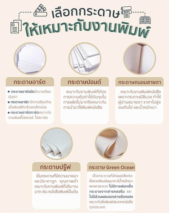การเลือกกระดาษที่เหมาะสมสำหรับงานพิมพ์เป็นสิ่งสำคัญ เพราะกระดาษแต่ละชนิดมีคุณสมบัติแตกต่างกันในหลายด้าน