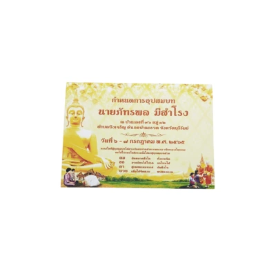 - เราพร้อมผลิต การ์ดเชิญงานบวช ที่มีดีไซน์สวยงามและรูปแบบที่หลากหลายสำหรับงานบวช เพื่อเชิญชวนแขกมาร่วมอนุโมทนาบุญ