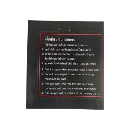 ขนาดยอดนิยม | 2.5×6 นิ้ว, 3×7 นิ้ว, 9×5.5 ซม., 8.7×5.3 ซม. | A5, A6, 7×10 นิ้ว, Custom | ส่วนลด/กำนัล/ตั๋วเข้างาน |