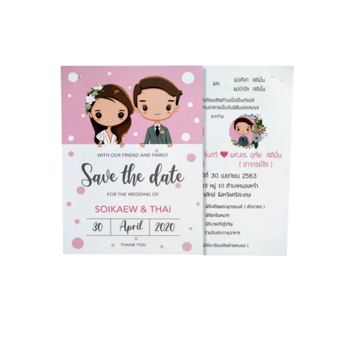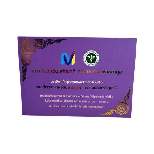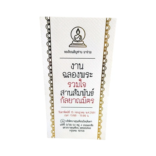 - ยกระดับความหรูหราด้วยการเพิ่มเทคนิคพิเศษ เช่น การ ปั๊มฟอยล์ทอง หรือการ ปั๊มนูน ที่ชื่อเจ้าภาพหรือชื่อคู่บ่าวสาว เพื่อสร้างความรู้สึกพรีเมียมและน่าจดจำ